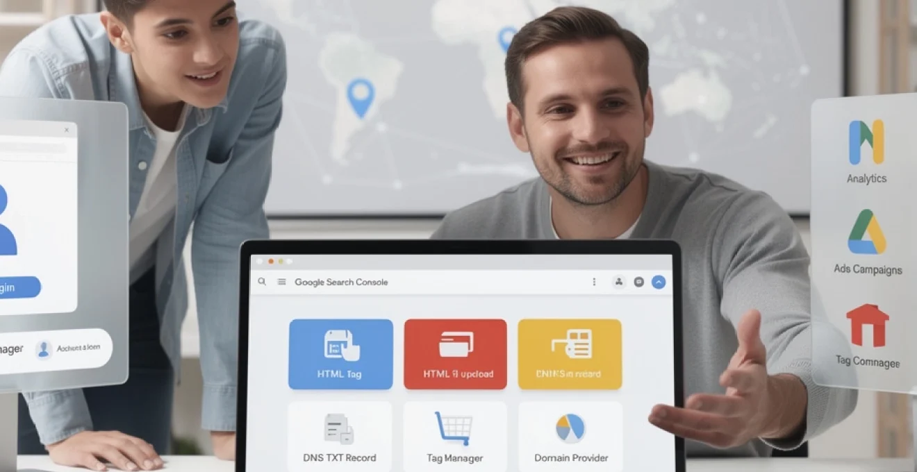 Avec Google Analytics 4, il suffit que le tag soit correctement installé sur le site et que votre compte Google dispose des droits d’administration. Dans Google Search Console, vous choisissez la méthode de vérification par Google Analytics, puis vous suivez les étapes de confirmation. Pour Google Tag Manager, le principe est similaire : si le conteneur GTM est en place avec le bon ID et que vous avez les autorisations nécessaires, la vérification se fait en quelques clics. Cette méthode évite d’ajouter des balises supplémentaires dans le code et centralise les vérifications autour des outils de mesure déjà utilisés.